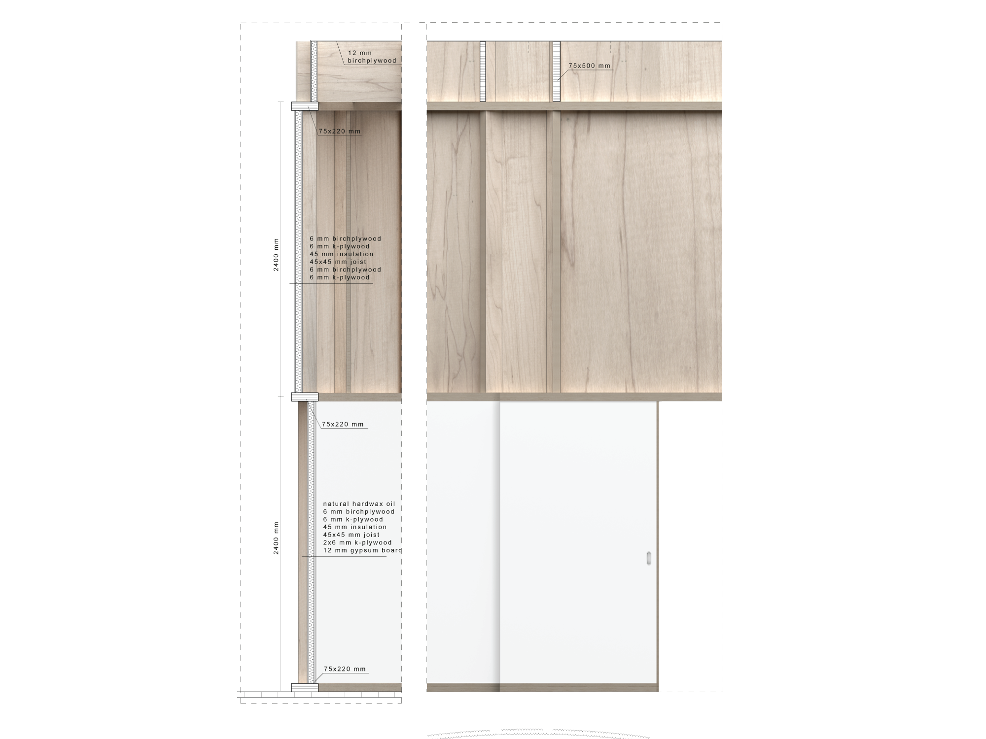 Orientation through the volume is further clarified by the exposed roof structure, where the wooden beams span between the different openings, producing a distorted grid. This distortion is subsequently reflected in the exposed columns, placed in an irregular rhythm and angled according to the direction of the corresponding beam. Thus, a certain tension emerges between the overall straightforward geometry of Deus Ex Machina, and its structure seemingly abiding by its own logic – combining rationality and economy with playfulness and identity.